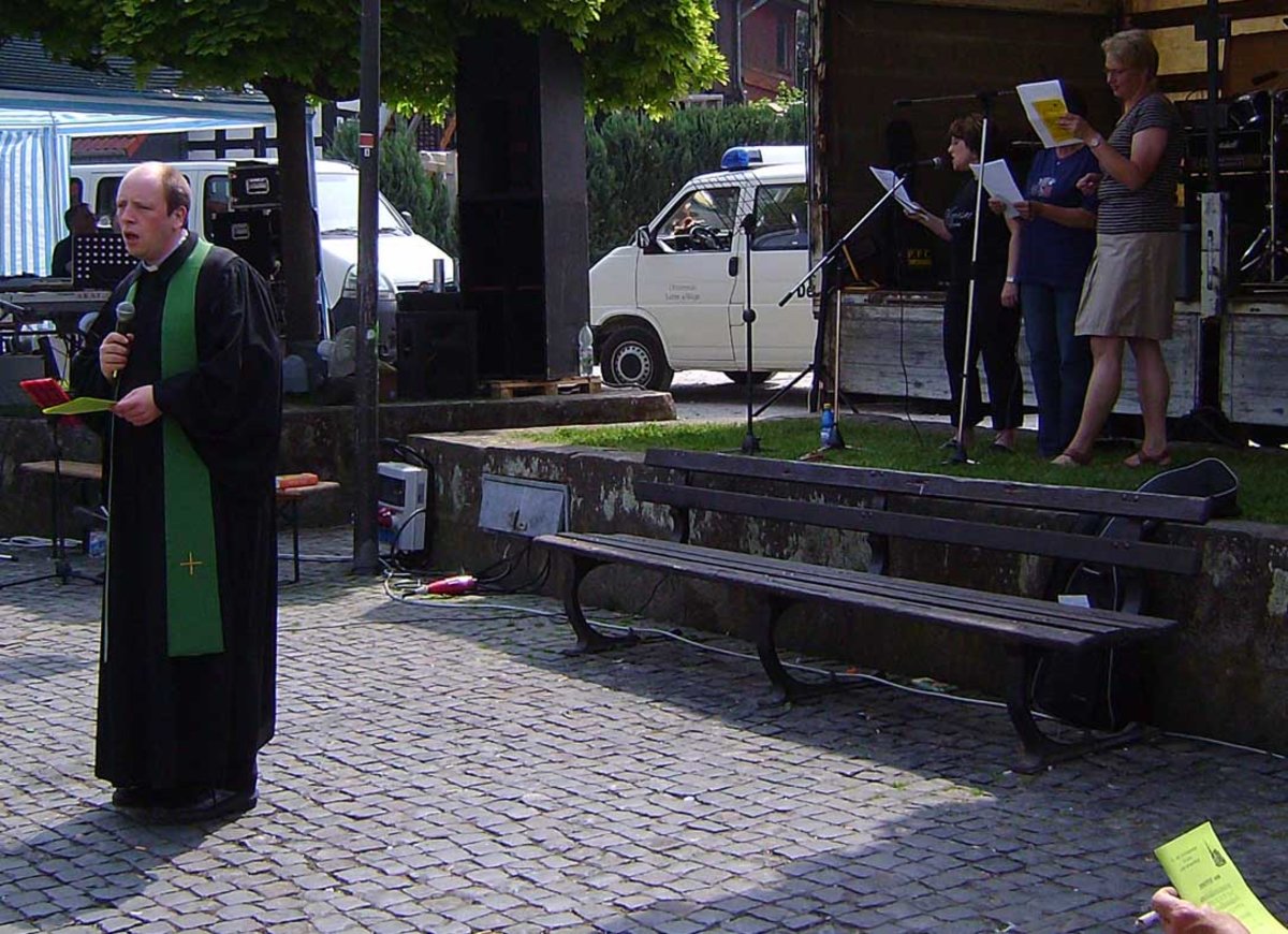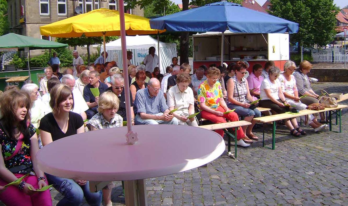 Das Dorffest wurde wie im Vorjahr mit einem Gottesdienst auf dem Marktplatz eröffnet. Ein kleiner Spontanchor unterstützte die Gemeinde beim Singen der Lieder mit Keyboard und Gitarre, die 'Jokers' stellten ihre Lautsprecheranlage zur Verfügung - herzlichen Dank dafür.